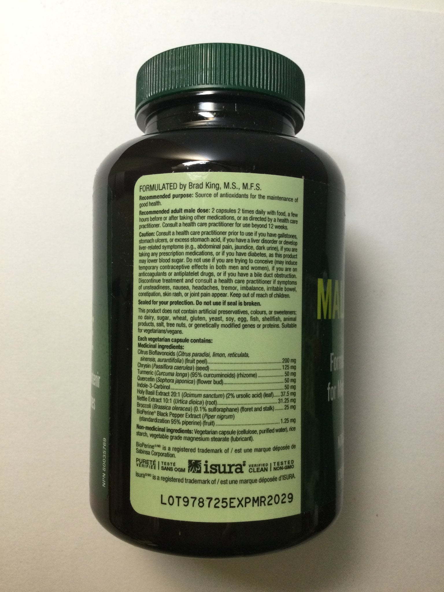 120 Veggie Capsules, formulated specifically for men’s optimal health, non-GMO, Gluten-free, formulated by Brad King, M.S., M.F.S.